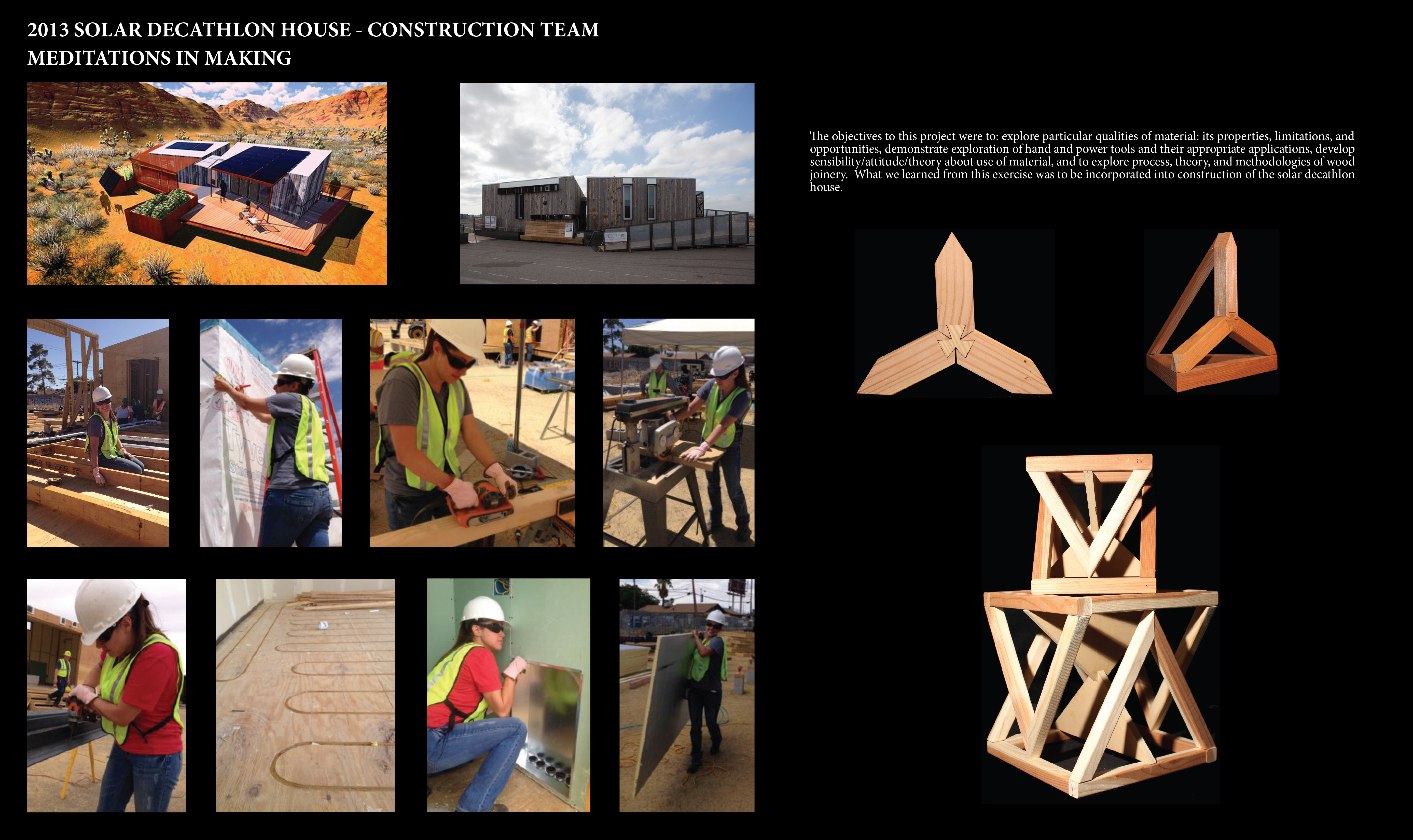 The objectives to this project were to: explore particular qualities of material: its properties, limitations, and opportunities, demonstrate exploration of hand and power tools and their appropriate applications, develop sensibility/attitude/theory about use of material, and to explore process, theory, and methodologies of wood joinery. What we learned from this exercise was to be incorporated into construction of the solar decathlon house.