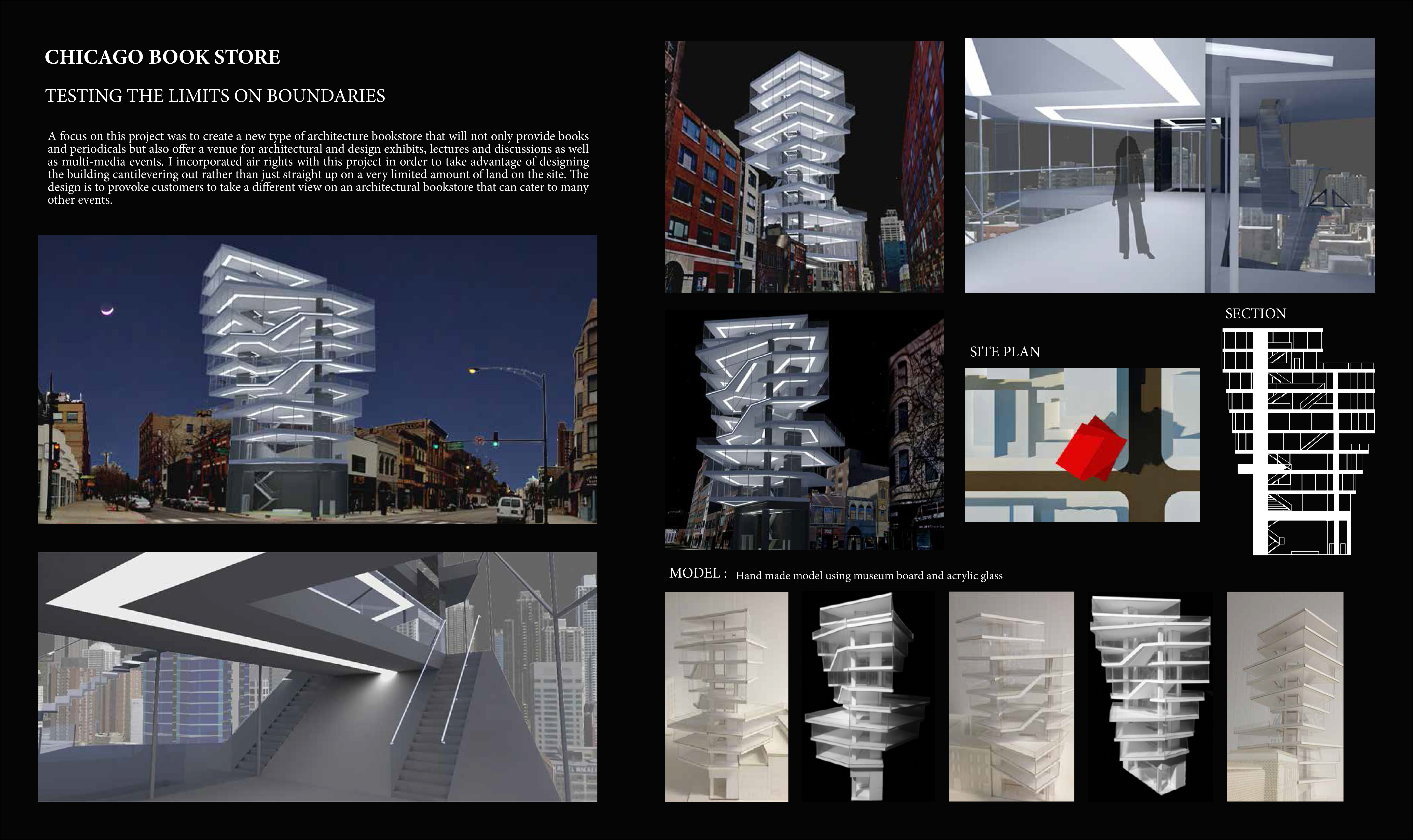 A focus on this project was to create a new type of architecture bookstore that will not only provide books and periodicals but also offer a venue for architectural and design exhibits, lectures and discussions as well as multi-media events. I incorporated air rights with this project in order to take advantage of designing the building cantilevering out rather than just straight up on a very limited amount of land on the site. The design is to provoke customers to take a different view on an architectural bookstore that can cater to many other events.