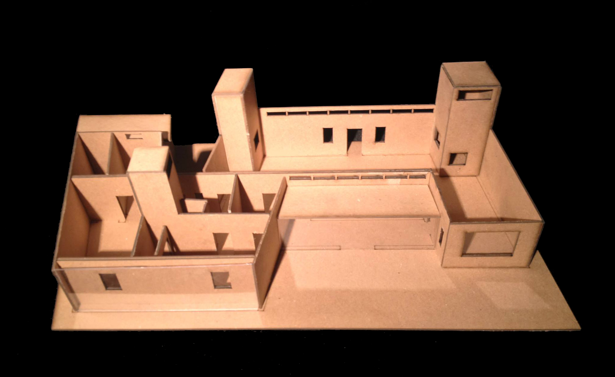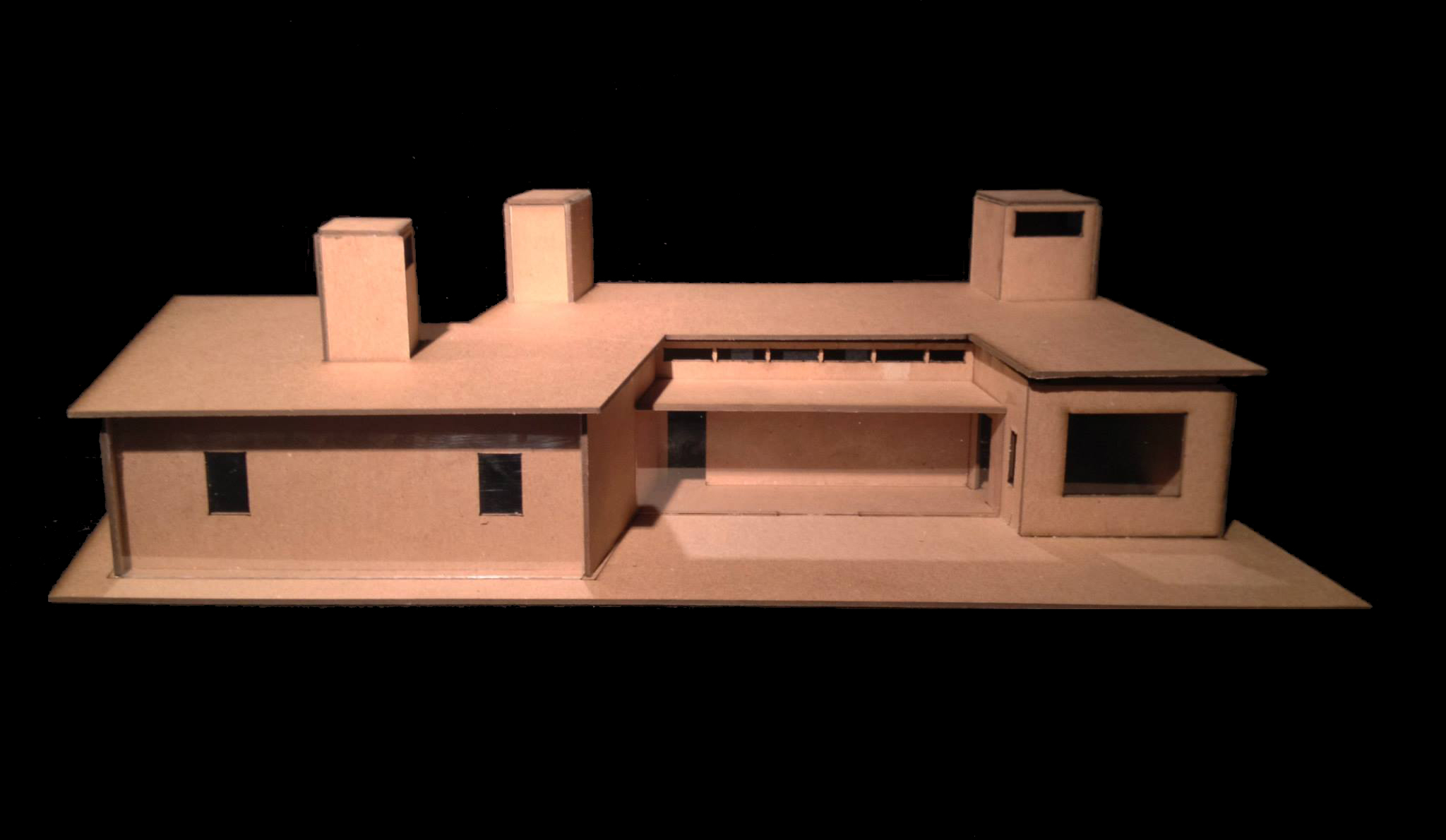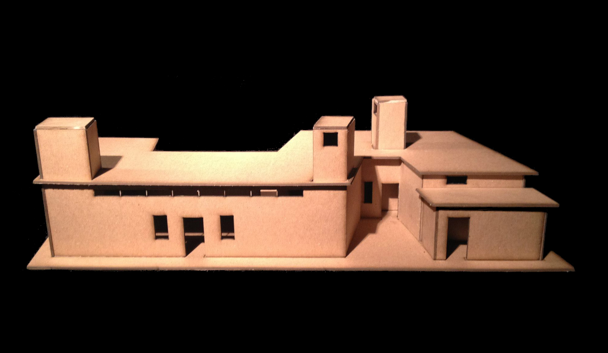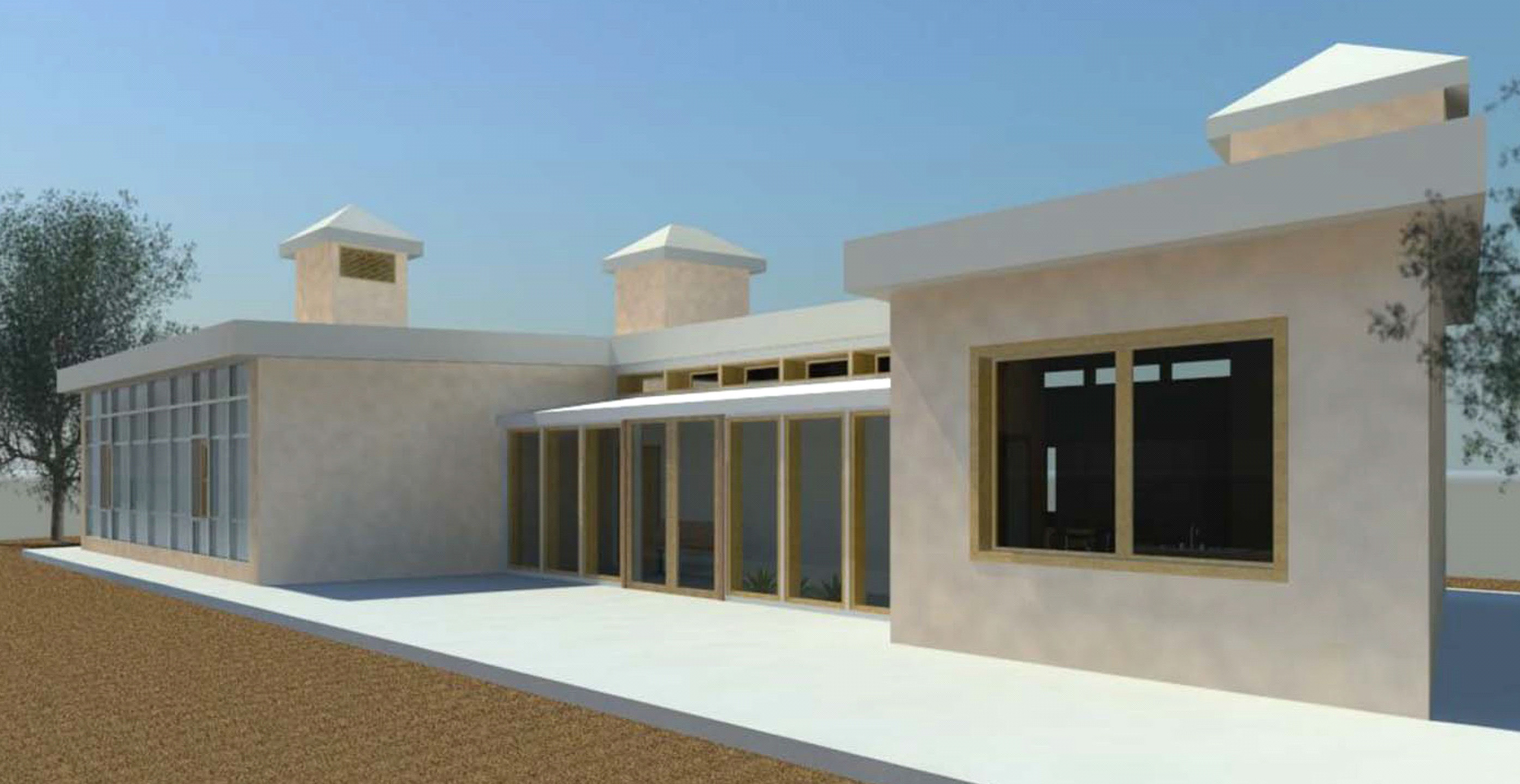 The Moapa Paiute Net-Zero Home was a group project that was completed over a three week summer course called Solar Applications in Architecture. In designing a net-zero home, we implemented passive and active solar strategies. We intended to manipulate the formal and spatial qualities of our building to adapt to both the local desert climate and to the needs of our clients. Approaching the house, one is welcomed by the walls pointing towards the sunspace. A thermal mass wall runs cuts through the building’s main axis, creating a divide between the public and the private. This allows for the communal activity in the living spaces while allowing for undisturbed intimacy within the back of the house. However, the form of the building then evokes the imagery of clasped hands, connecting the two realms at the building’s core. This imagery remains consistent with the cooling tower and solar chimney in the living space. They face each other, allowing for air transfer to occur between the two systems seamlessly. At the same time, they spatially connect both sides of the living area, and with the open nature of the space, it becomes all interconnected at multiple levels. Finally, we introduced a PV system atop a slightly sloped roof to take advantage of southern Nevada’s abundant solar resources.