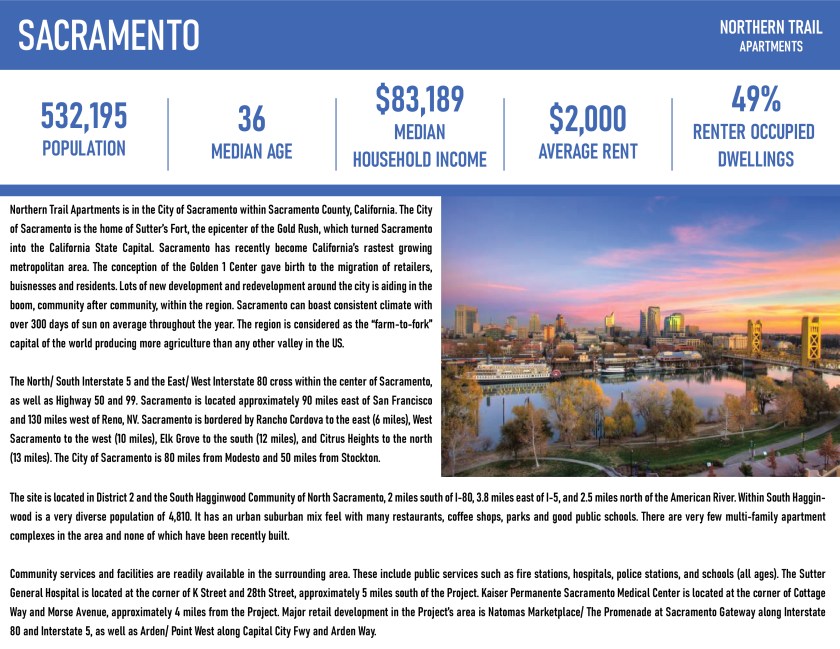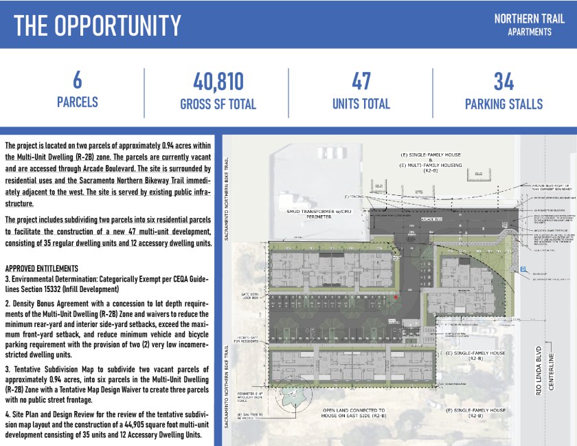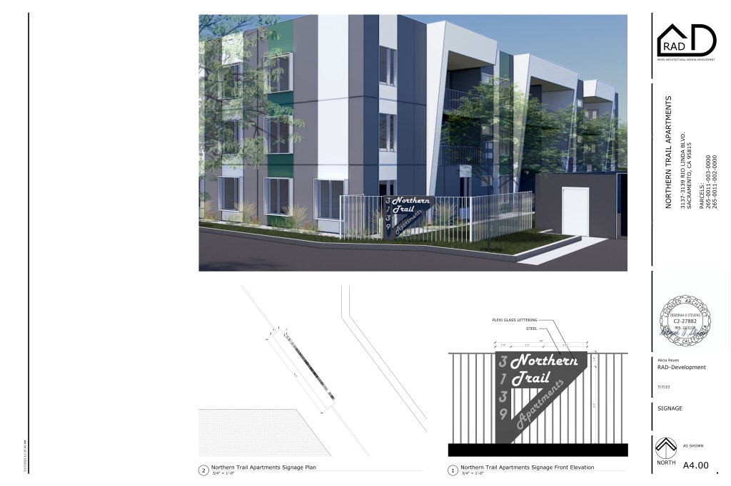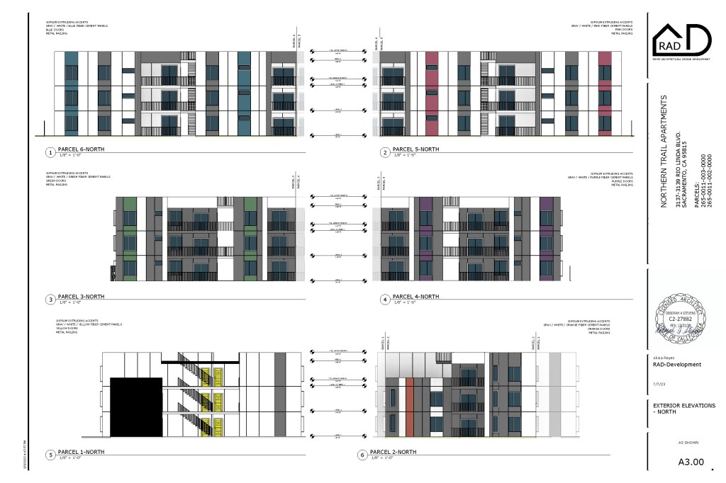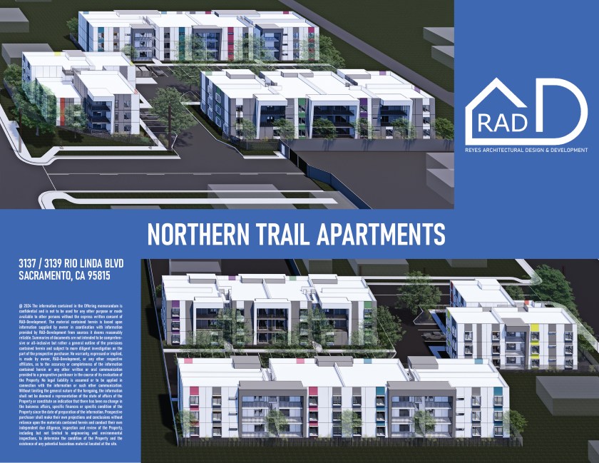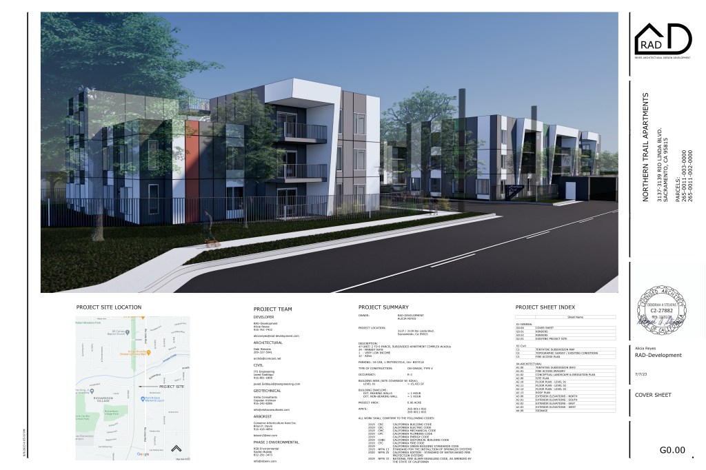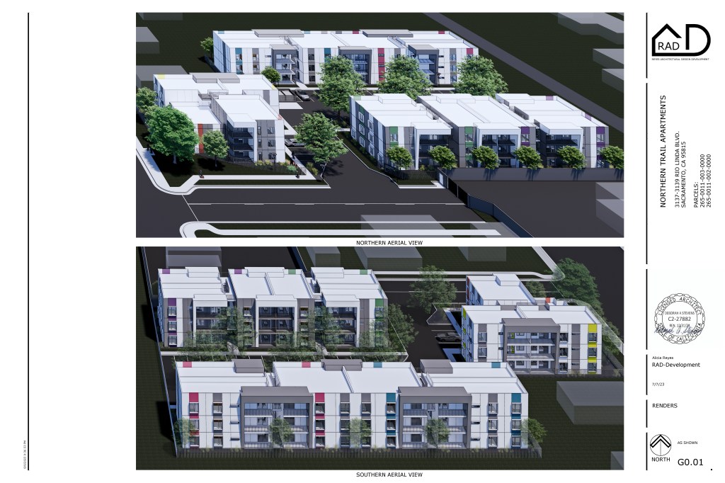 During the California housing crisis, District 2 of the City of Sacramento is in need of regeneration and resilience through the creation of housing density. The introduction of diversity in living accommodations creates economic opportunity to the inhabitants. The complex is between the Sacramento Northern Bike Trail and a routine bus stop. It promotes social interaction and transit-oriented development with an upgraded bus stop and access to the trail. To reduce the heat island effect, promote environmental sustainability, and incentivize the transportation options, the project incorporates 34 covered and protected bicycle spaces, 1 motorcycle spaces. The public road and sidewalks are all to be improved and updated. The project will be all electric and have rooftop solar panels to avoid greenhouse gas emissions and create a clean energy, pollutant free environment.
