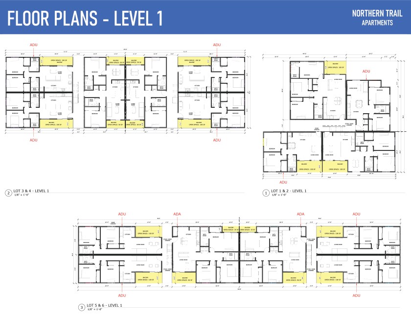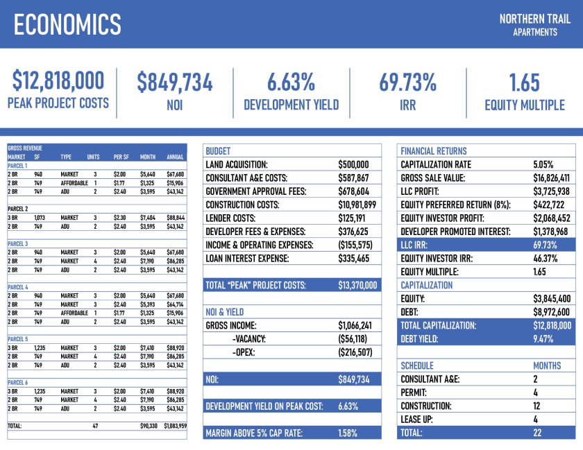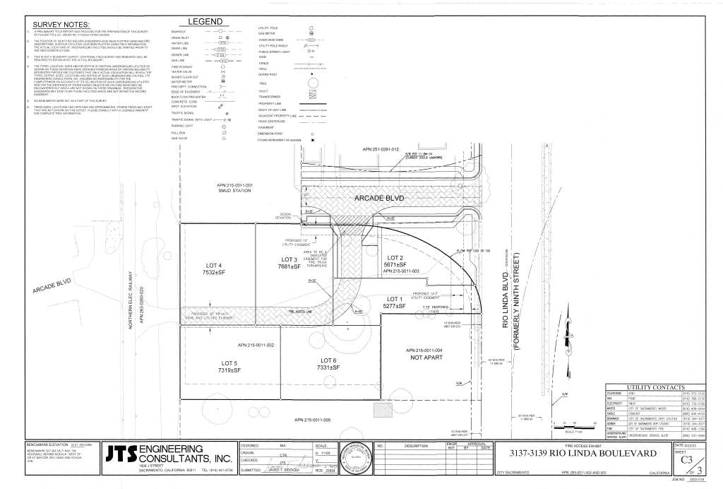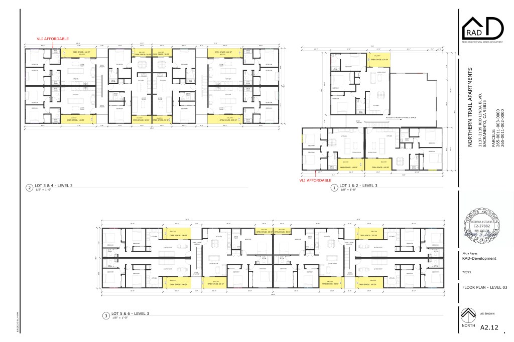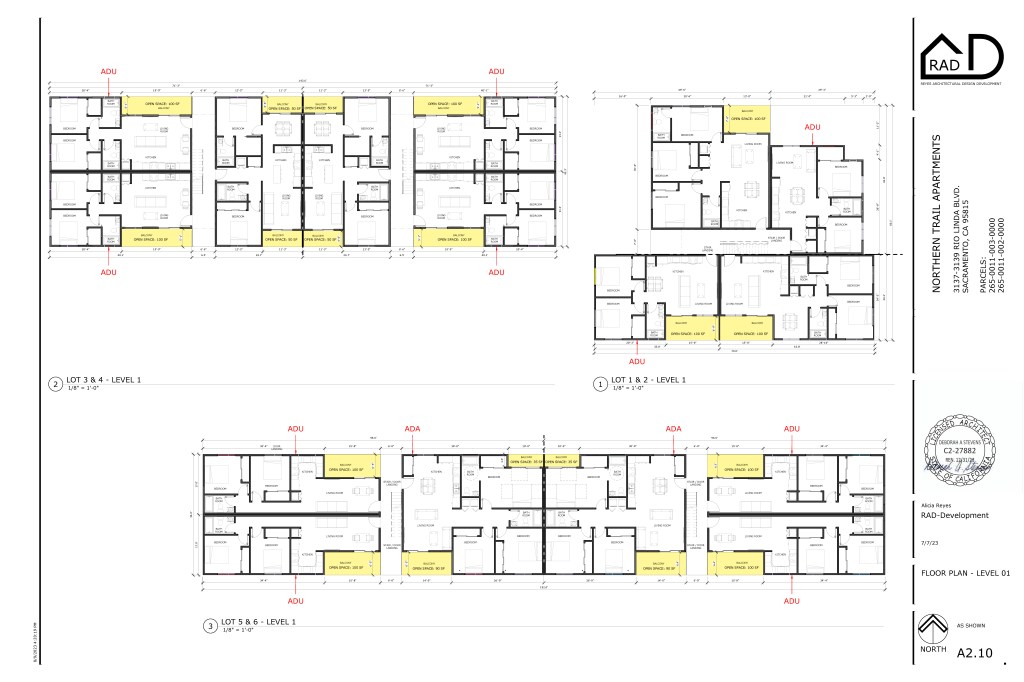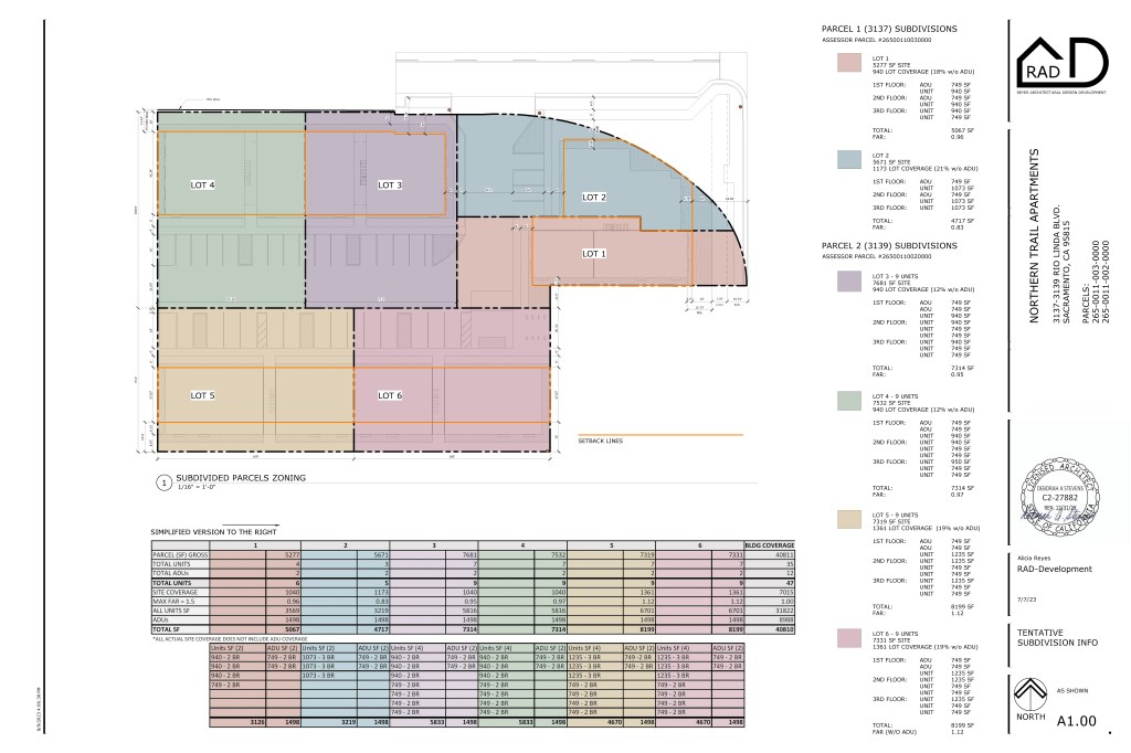 The project is subdivided to take advantage of the new Multi-family ADU bills to promote density. This provided the opportunity to create two ADUs on each parcel for a total of 12 in addition to carefully laid out parcels for the perfect amount of units on each. The project also incorporates affordable housing which creates a density bonus of 20%. Using the Sacramento General Plan updates the site to 30 unit density. All of these options takes the density of the site to 47 units.