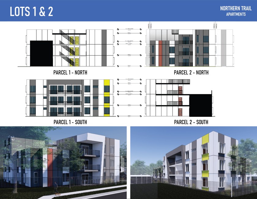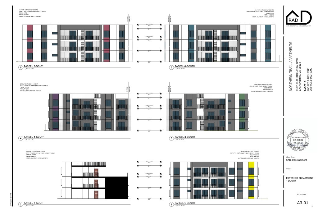 The design intent of the project is to have a fiber cement cladding system for a clean modern style which embraces the minimalist ideals with the use of contemporary textures and clear architectural lines to connect with many sought-after mid-century Sacramento neighborhoods. Public and private spaces are incorporated through the 100 sf balconies and accessible rooftops. Minimal water consumption and runoff is controlled through the use of xeriscape landscaping, french drains, and permeable sidewalks. Each color on the buildings represents the different subdivided parcels and give relevance to the unit of the occupant.