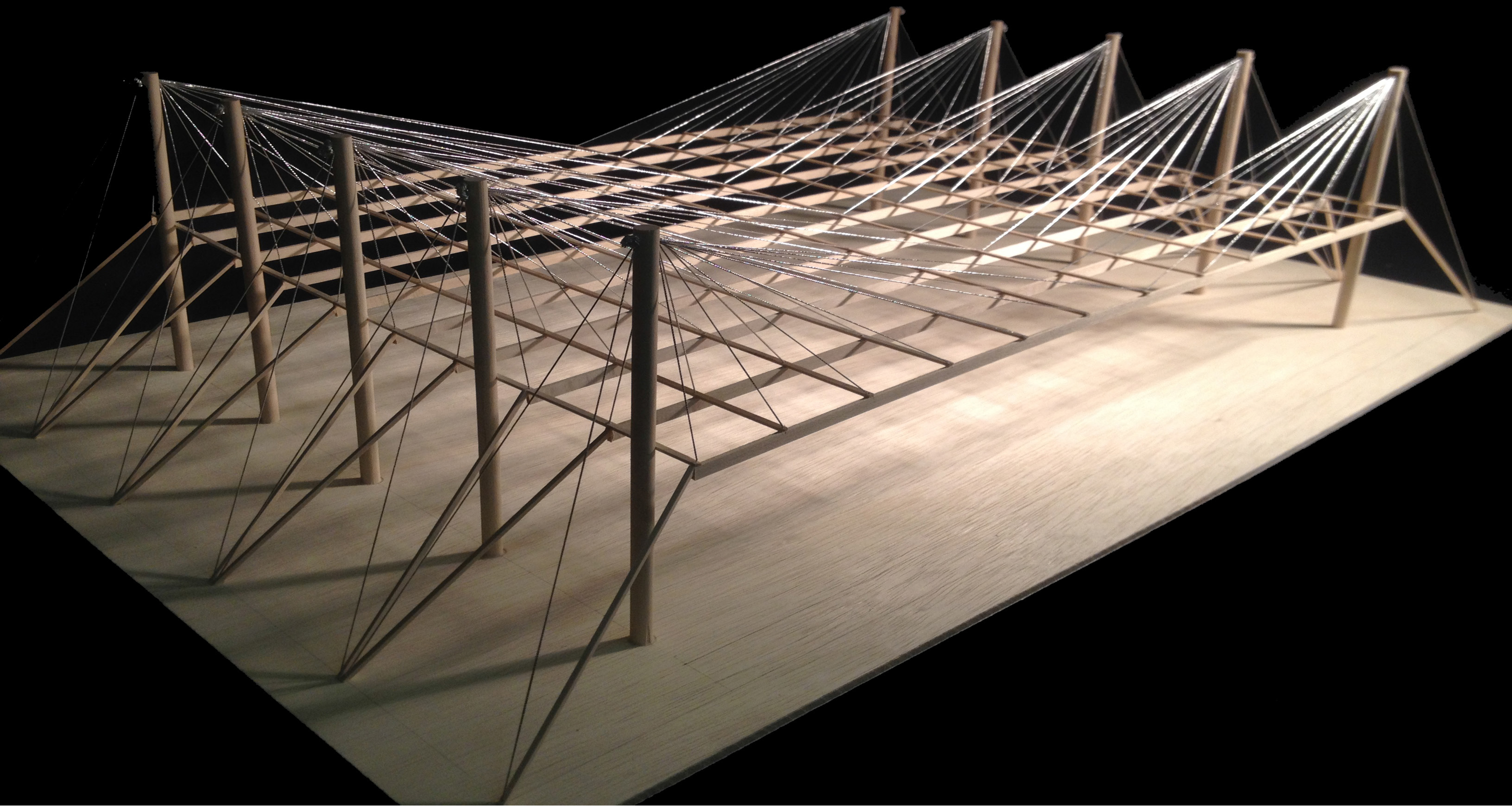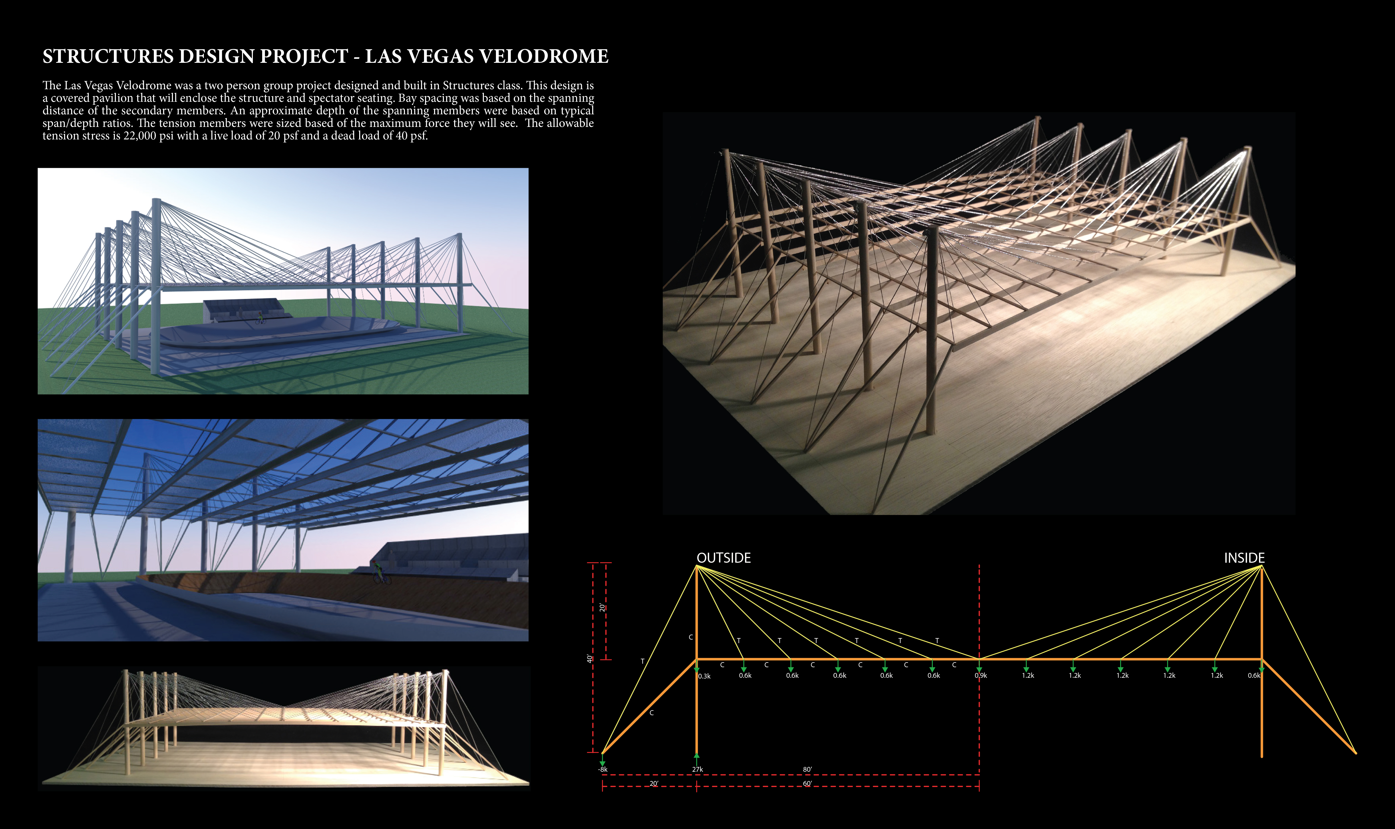 The Las Vegas Velodrome was a two person group project designed and built in Structures class. This design is a covered pavilion that will enclose the structure and spectator seating. Bay spacing was based on the spanning distance of the secondary members. An approximate depth of the spanning members were based on typical span/depth ratios. The tension members were sized based of the maximum force they will see. The allowable tension stress is 22,000 psi with a live load of 20 psf and a dead load of 40 psf.